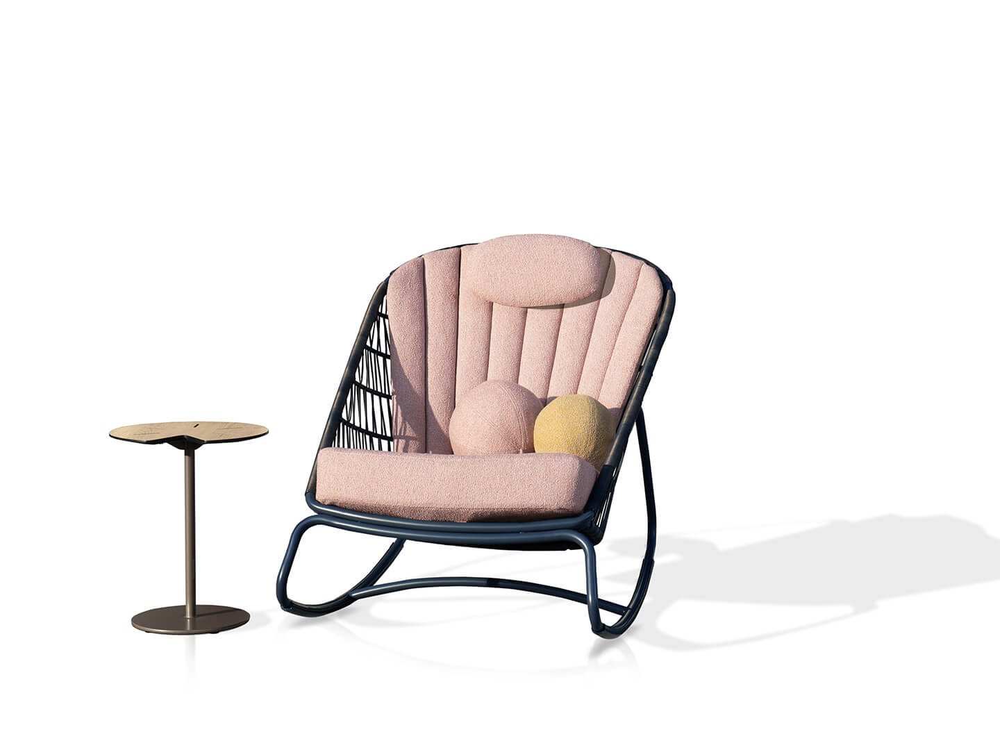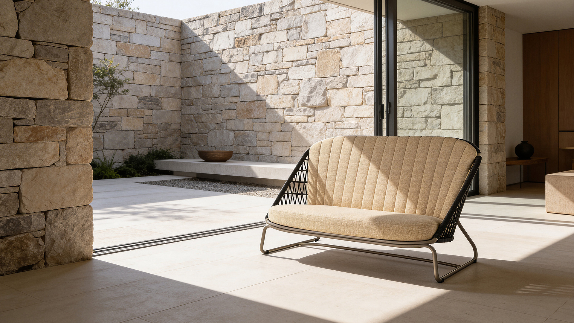 BONO brings a relaxed elegance to any outdoor setting, where its powder-coated aluminum frame pairs beautifully with handwoven fiber, creating a harmonious balance of strength and softness. Wrapped in BONO’s signature weave, the entire set captures a rare balance of casual yet grand presence.