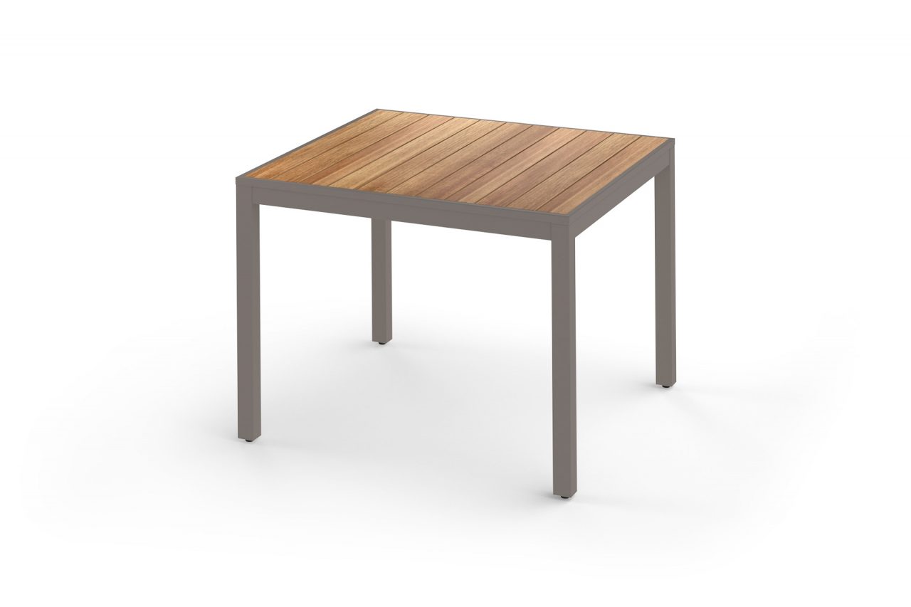 ALLUX dining tables are highly practical, easily customized outdoor seating solutions. This option uses standard, smooth teak slats for elegant, modern design dining. This is the smallest of the three sizes available.