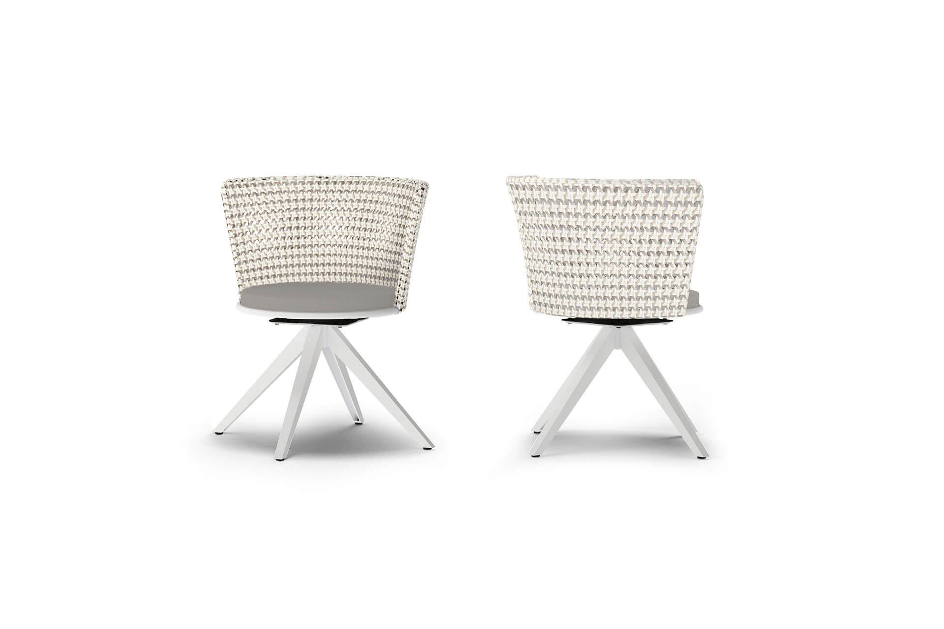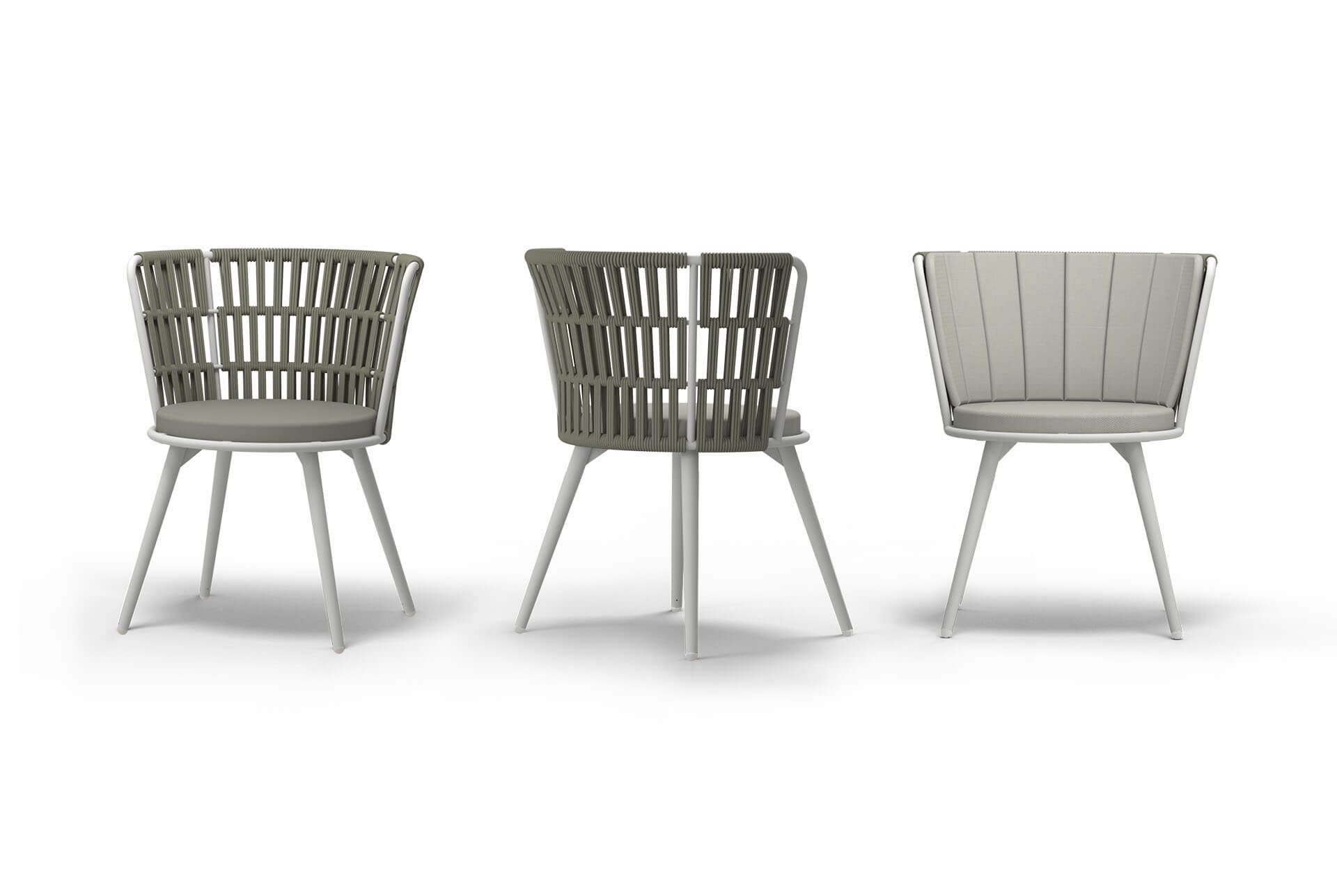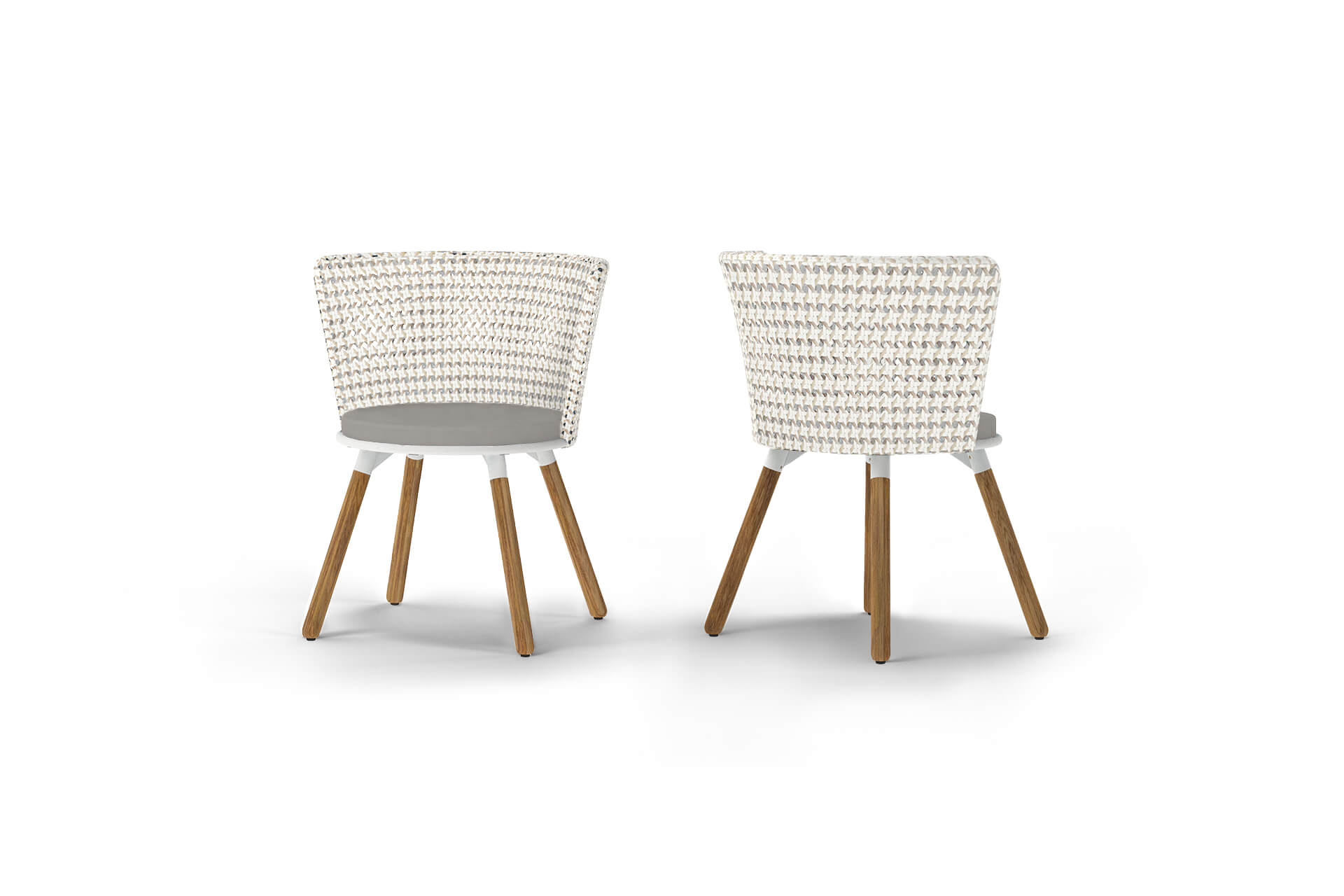 DAISY Dining Chairs feature DAISY MAE with a woven wicker shell and DAISY RAE with a woven rope shell. The collection includes three leg options: aluminum, teak, and a swivel base.