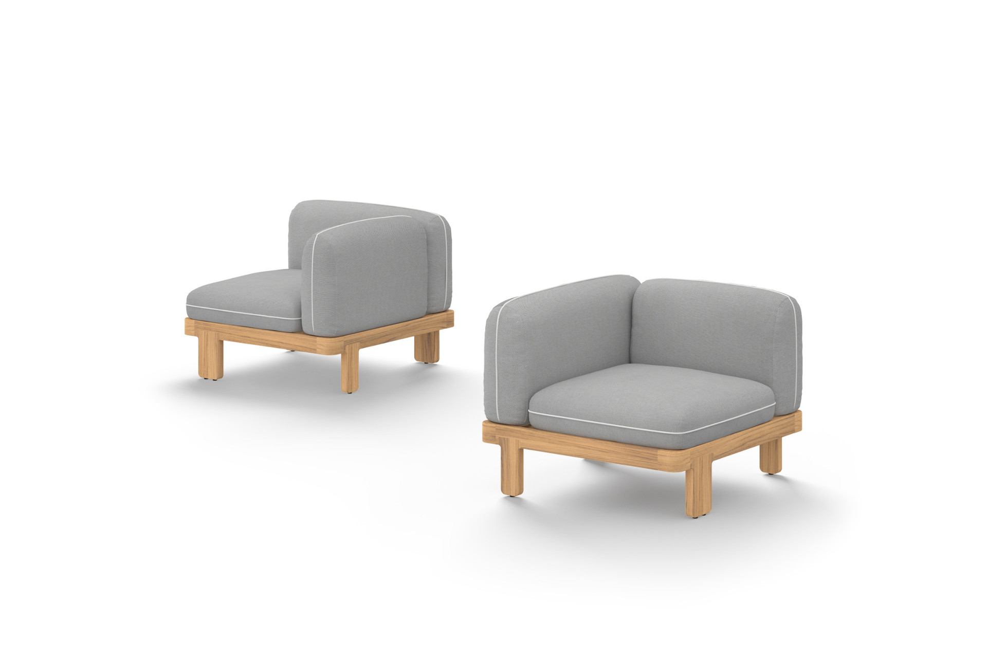 The HACIENDA Sofa System supports multiple configuration layouts through its elements: module, corner, ottomans, and sectional table. Connected with integrated connectors. Complemented by 2-seat and 3-seat sofas. Available in three teak finishes.
