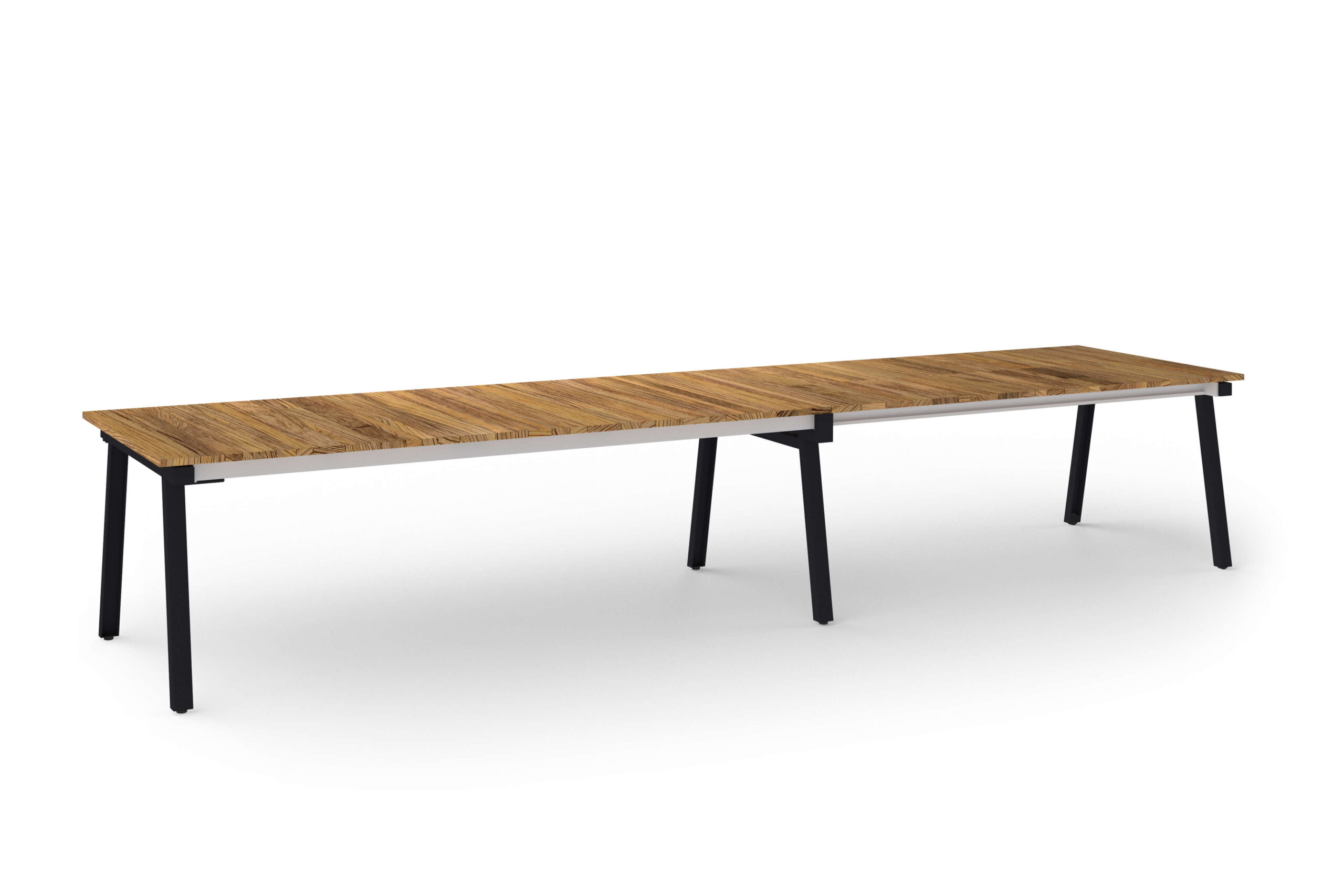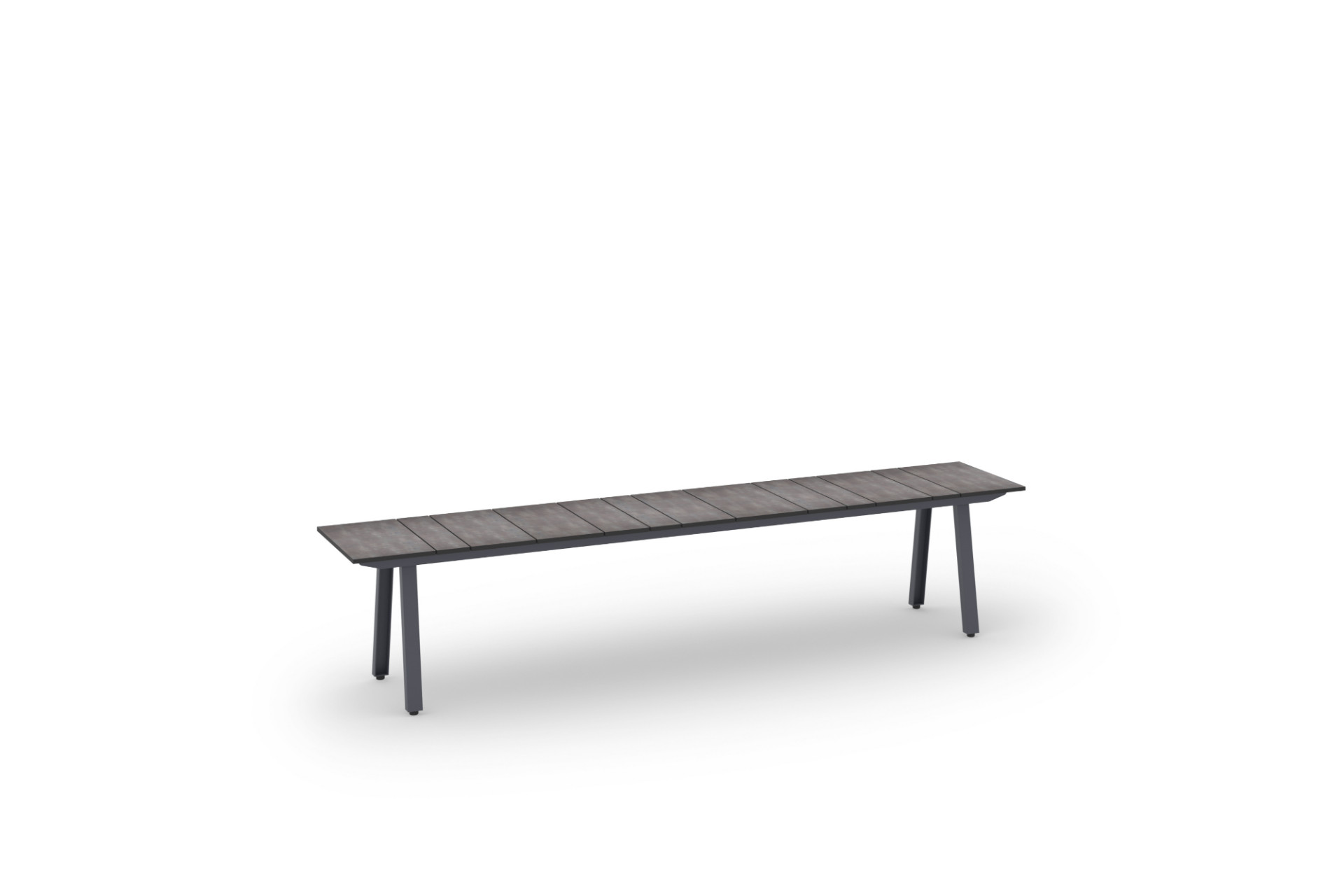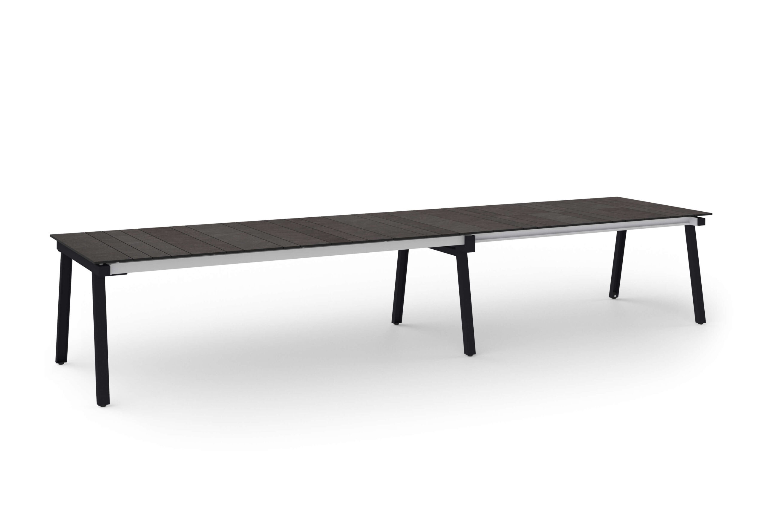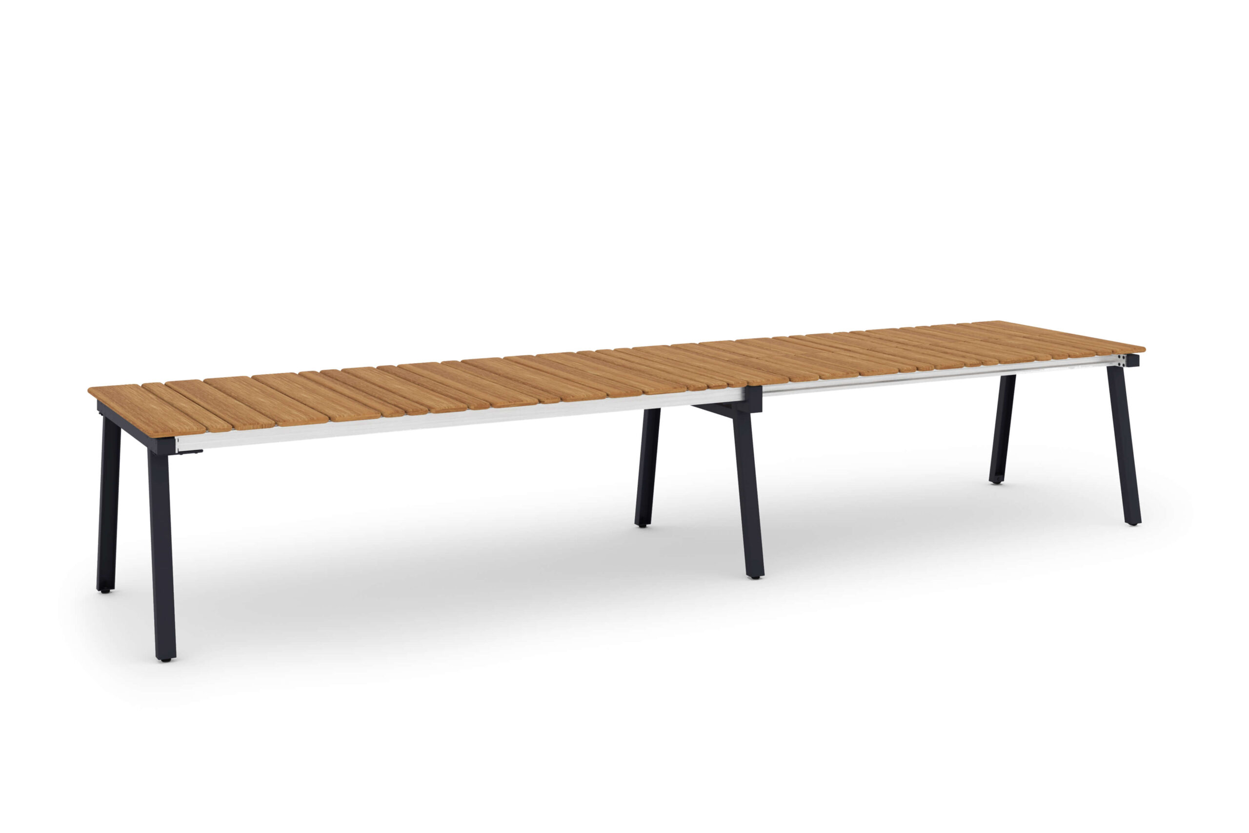 MAXXIMUS Extension Tables come in three sizes—L, XL, and XXL—with three tabletop options: smooth teak, brushed teak, and HPL. Seating ranges from 4 to 12 people. Legs have a knockdown construction, and benches are available for all sizes with additional cushion.