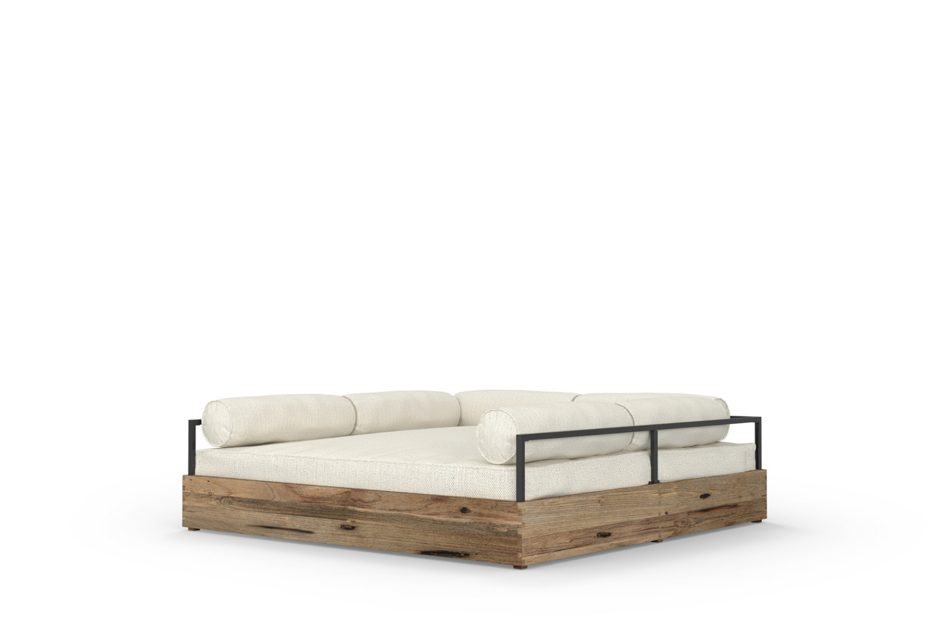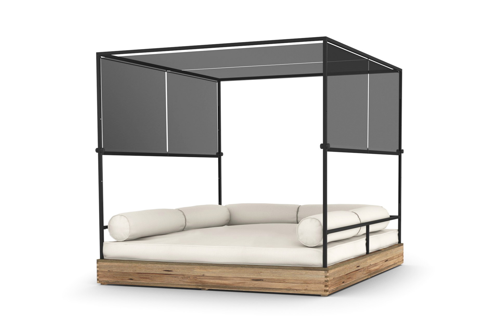 Designed for a resort-style experience, the AIKO daybed features a thick, plush cushion and ergonomic bolsters, and is available in two sizes, with or without a canopy.