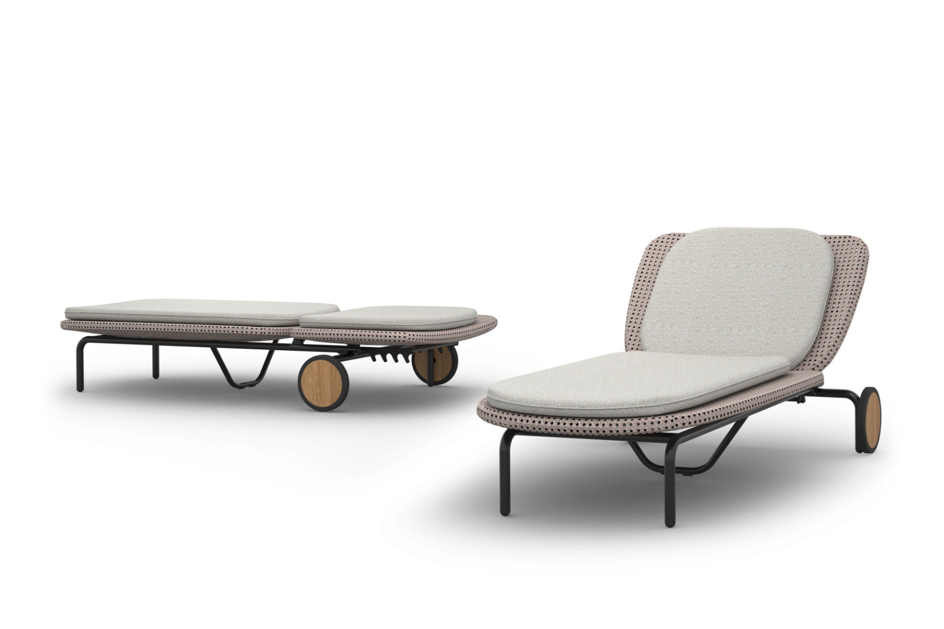 CLARA Lounger is equipped with an adjustable reclining backrest that can be set to four different positions. It also features integrated wheels with a light brushed teak accent to facilitate easy movement.