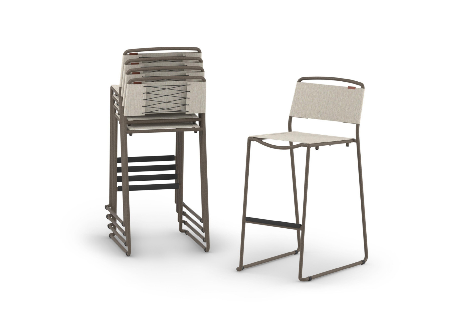 The STARLETTE Chairs offer stackable sled-bases for side, counter, and bar chairs. The seat and backrest feature a sling design with corset-inspired detailing. Optional padded cushions are available for added comfort.
